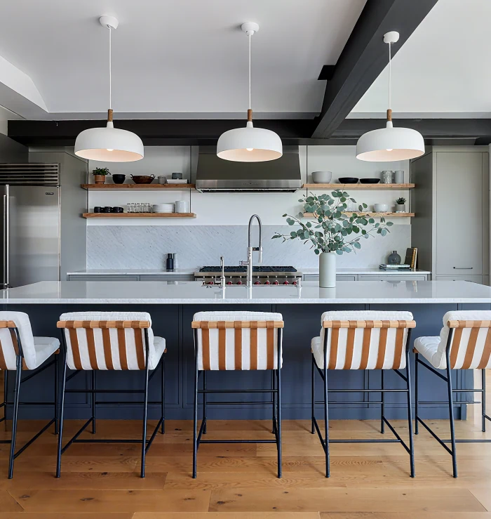 Atmosphere: Clean, sophisticated. Metallic or dark-toned stools perfectly complement lighting, appliances, and hardware.