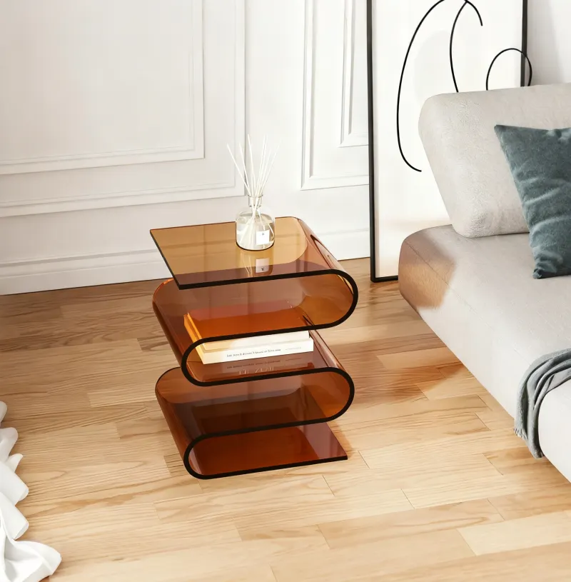 Let's look at this eye-catching end table. Made of acrylic, this side table abandons heavy glass, creating a visually clear and light feel. It's suitable for any small space, such as next to a sofa, bed, or window.