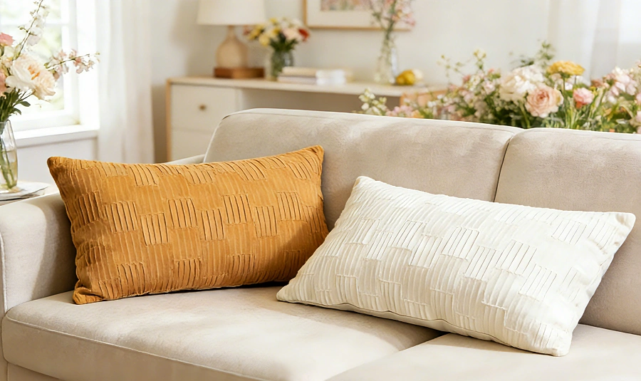 Most of your pillows should be timeless neutral textures that work all year. Then add one or two seasonal pops. Pair them with a floral cover, and your sofa feels fresh.