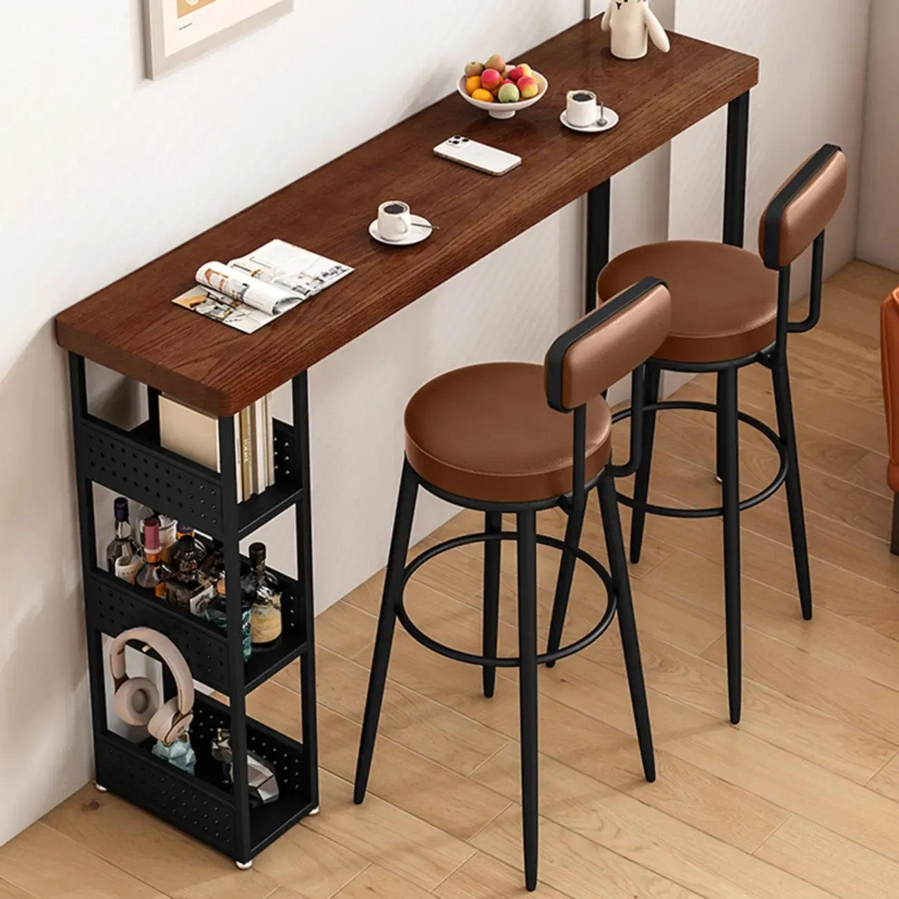 Rectangular Brown Wooden Metal Storage Bar Table