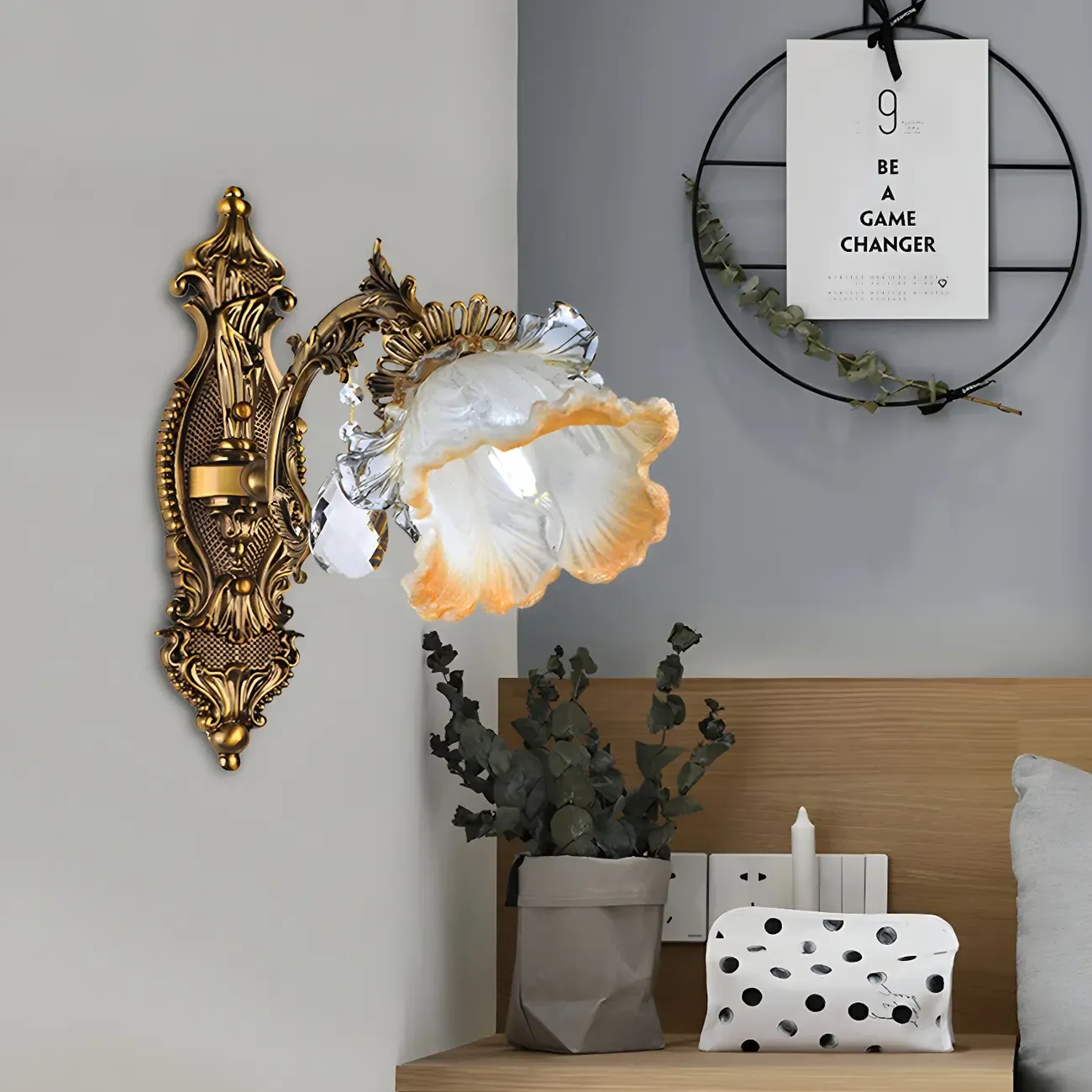 Vintage Gold Crystal Flower Shade Bedside Wall Sconce