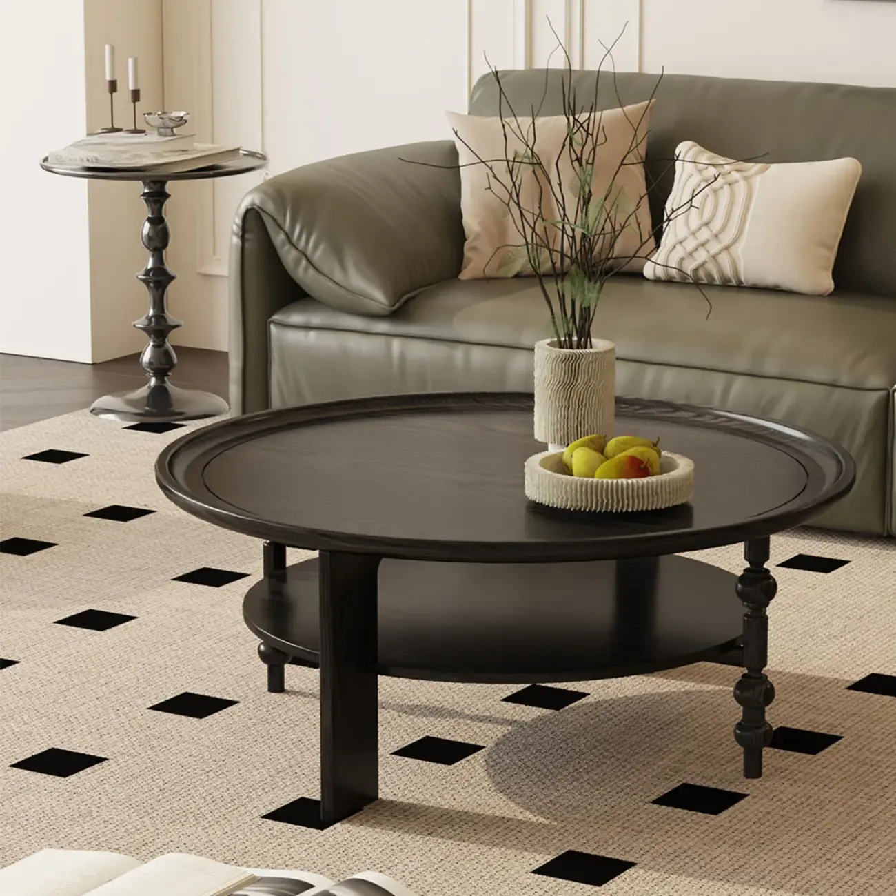 Vintage Wooden Round Coffee Table with Shelf & Tray Top